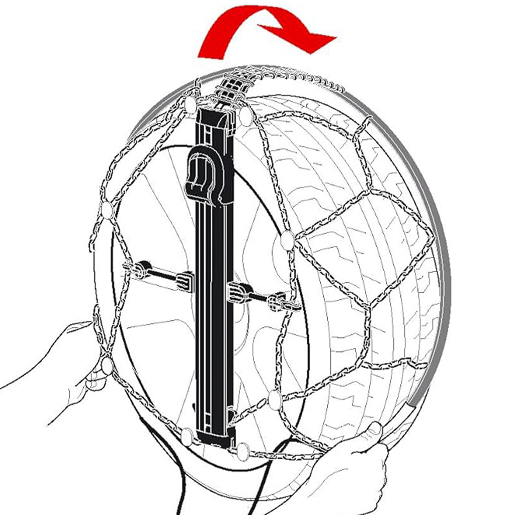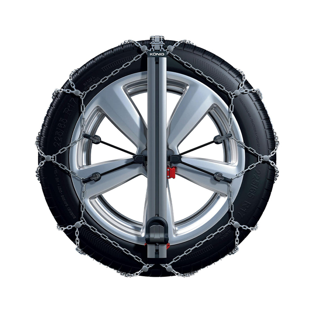 De König Easy-fit SUV heeft een schakeldikte van 10 mm en is binnen 12 seconden te monteren. De sneeuwketting is voorzien van een aluminium middenstang met een automatisch spanningssysteem: klap het ingebouwde pedaal uit en activeer het zelfspannend systeem met je voet. De ketting glijdt vanzelf om de band zodra de auto gaat rijden. Demonteren gaat even eenvoudig: Druk gelijktijdig op de rode knoppen op de aluminium stang en ontkoppel de veiligheidsgrendel om de ketting los te maken. Je kunt nylon bumpers aanbrengen om alu velgen te beschermen.