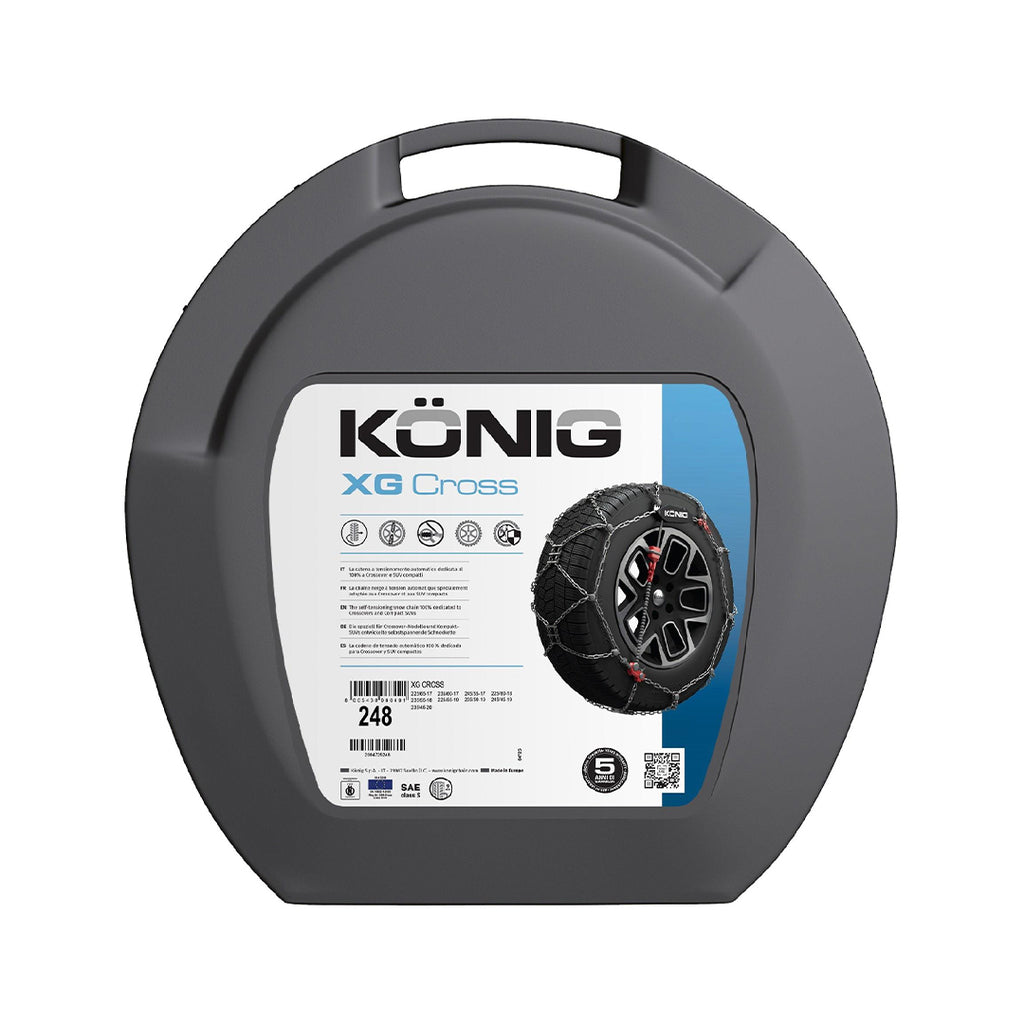 De XG Cross van het kwaliteitsmerk König beschikt over een speciaal ontwerp dat is gebaseerd is op de specifieke behoeften van de nieuwste generatie compacte SUV's en Crossovers. De ketting past op zowel zomer, winter of all season banden. De ketting heeft een 9mm binnenruimte nodig in de wielkast en kan automatisch gespannen worden tijdens het rijden. De König XG Cross beschikt hiernaast ook over de V5117 en EN 16662-1 certificering.